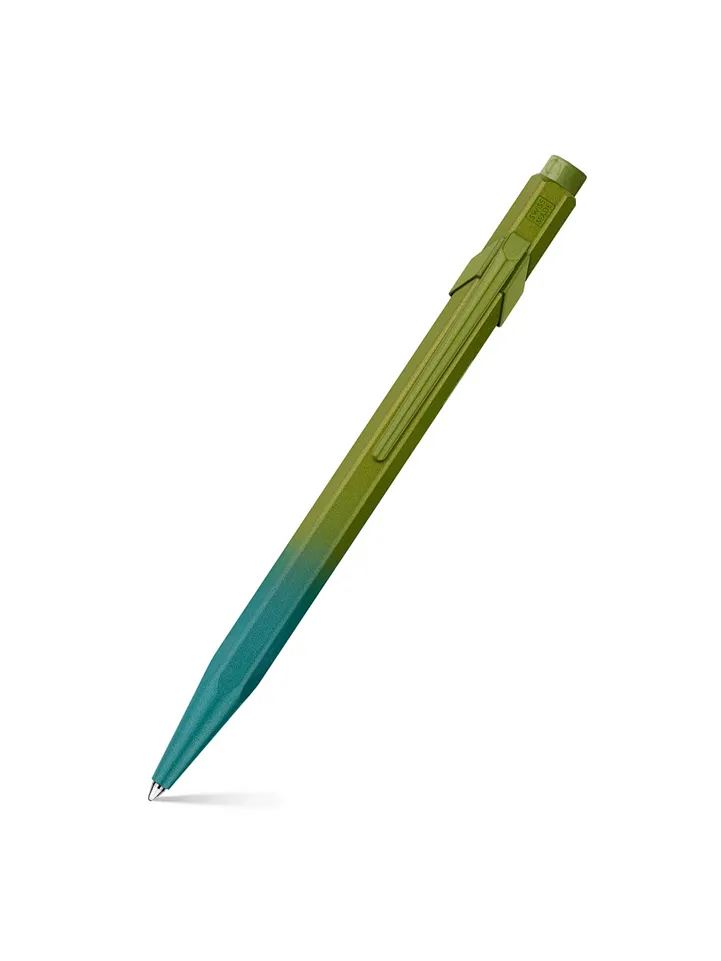 The Carandache 849 Green Arctic ballpoint pen is a sophisticated writing instrument featuring a hexagonal aluminium body that is lightweight yet durable. The design, inspired by the vibrant colors of nature's curiosities, showcases a metallic varnish that transitions beautifully from blue to green. Complementing this dynamic color shift, the pen is equipped with a metallic green varnished clip and button, creating a seamless tone-on-tone effect with the pen’s body.