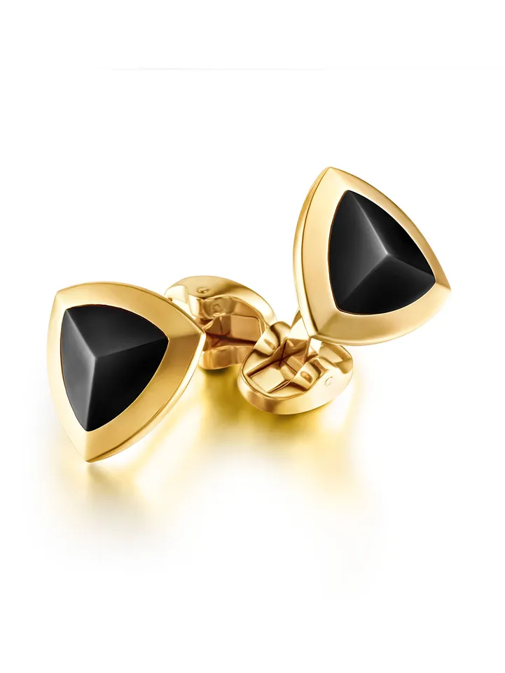 Ensure a luxury finish to formal looks with the Basildon Gold cufflinks that stands a cut above the rest. The sharp-faceted triangular gold visage in a mirror finish, is adorned with an inset of semi - precious onyx, carved out of a single stone. England is etched on the stem. They fasten with a custom-made logo engraved whale back closure for easy attaching. The cufflinks are presented in a plush Lapis Bard box and can also make a perfect gift that is guaranteed to be treasured for years to come.