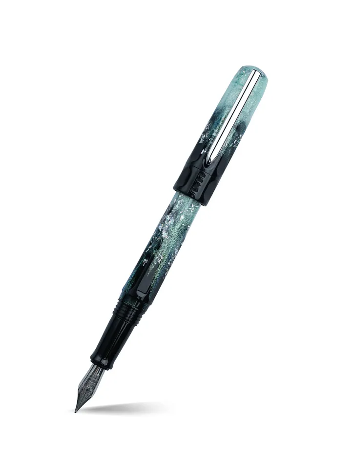 Edelweiss fountain pen from BENU's Talisman collection draws inspiration from the noble flower of the same name. The pen showcases a stunning blend of a black base transitioning into a shimmering light turquoise gradient, mirroring the natural beauty of the Edelweiss plant’s alpine surroundings. Silver foil-like flakes are scattered across the body, creating a frosted, sparkling effect reminiscent of snow-capped mountains. The cap is elegantly adorned with a sleek black ring engraved with the BENU logo, adding a refined touch to the design.This design incorporates actual dried Edelweiss petals into the pen’s material, connecting it with tales of myth and love surrounding the flower. It evokes the feeling of standing in alpine landscapes, where the Edelweiss blooms in its snowy beauty, historically representing love and courage.