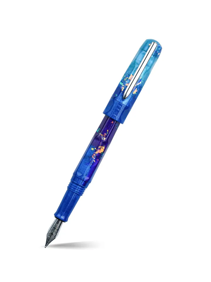 Peacock Ore fountain pen from BENU's Talisman collection is a vibrant and captivating design inspired by the iridescent tarnish effect of Peacock Ore, one of nature’s most colorful minerals. Revered as the "stone of happiness" for its believed ability to channel positive energy, this pen reflects that uplifting spirit through its striking colors and materials.The cap begins with a light teal at the top, gracefully fading into a deep, rich blue toward the center. The barrel features a smooth gradient, transitioning from a deep oceanic blue near the grip into a rich purple at the end. Scattered across the barrel, sparkling glitter flakes reflect a spectrum of colors depending on the light, mirroring the natural beauty of Peacock Ore. Beyond the visual appeal, an actual Peacock Ore powder is infused into the pen’s material, imbuing it with both the look and essence of the stone, making this writing instrument not only a beautiful design but also a symbol of joy and positivity.