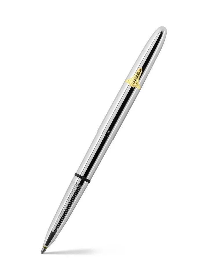 Classic Bullet Pen in Chrome with Shuttle Emblem. When closed, the Bullet Space Pen is the perfect size to carry in your wallet, pocket, purse, car glove box, organizer or toolbox; they will write upside down - at any angle, under water, through grease, extreme temperatures -30 to +250 degrees F, on almost any surface, three times longer than the average pen, and of course in the gravity free vacuum of space. When opened it's a full sized, evenly balanced writing instrument. The original Bullet Space Pen was conceived in July of 1948 by Paul Fisher, who was soon machining a new pen design shaped from solid aluminum. This became our first Fisher ball point pen, the #400 Bullet Pen, and arguably the most popular pen of the twentieth century. This pen is now composed of all brass with a chrome finish. Cited as an outstanding example of industrial art, the classic design of the Fisher Bullet Pen has been exhibited for years in the New York Museum of Modern Art. The Bullet's timeless styling has been the topic of many art books and magazine articles. Often imitated but never duplicated, the Fisher Bullet Space Pen continues to be the most popular pen.