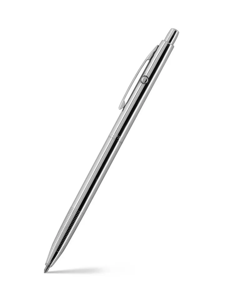Chrome Plated Shuttle Space Pen. In 1967, after over two years of rigorous testing by NASA, the Space Pen was selected for use by the astronauts of Apollo 7 and has been used on all manned space flights since then. The Shuttle Space Pen is the next installment to our line of Astronaut pens; it was introduced during the Space Shuttle Program and is the current pen of choice of the astronauts on the ISS today. The CH4 is proudly produced in the USA Each is made of solid brass with hard chrome plating. The CH4 is thinner and lighter than its predecessor the AG7, with a slightly more sleek and modern appearance. It features a unique clicking mechanism that extends the point via the button on the top, with a release button on the side to retract it. This side button has a substantial sound and feel to it, ensuring that you will always remember to retract the point before sliding the pen back into your pocket. Shuttle Pens are packaged in our heavy duty gift box with flock lining, and each comes with a guarantee and a pamphlet describing the history of Fisher Space Pen Co.