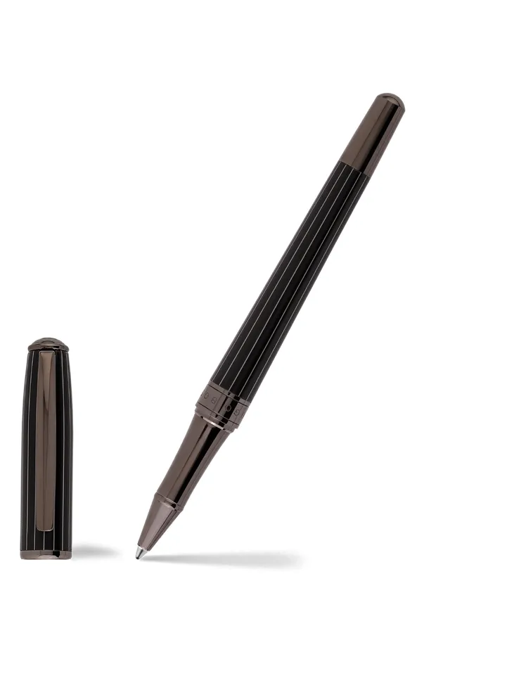 The Essential pen is reinterpreted in a pinstripe-printed, dark, masculine version, referencing Hugo Bosss background in fine tailoring. With its timeless shape, this elegant and elevated new version speaks to a desire for excellence.