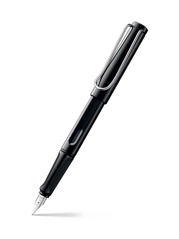 This is the Lamy Safari - the best-selling collection from Lamy, readily identifiable because of its iconic clip. Classic safari design fountain pen in gloss black. Tough ABS plastic, triangular grip area, ink level window and strong chrome-plated brass pocket clip. Fountain pen comes fitted with the Z28 converter for bottled ink. A cartridge can also be used. This pen features a steel nib. Also Available with Broad, Extra Fine and Fine Nib