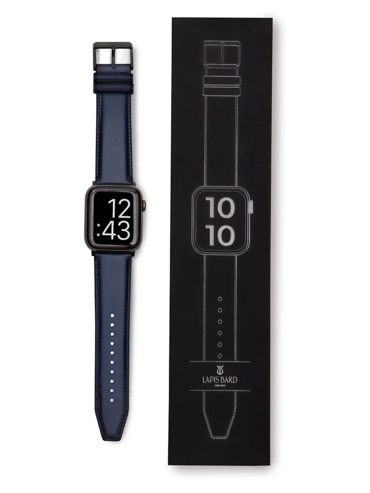 This gorgeous leather strap in sumptuous navy blue is the perfect foil for your Apple watch. The rich colour deepens at the edges, giving the piece a sublime finish. Secured by two loops and a sturdy stainless-steel buckle with black ion plating, the full grain leather strap is retro padded for optimum comfort. Wrap this precision cut beauty around your wrist for a timeless look¦ Add an Apple watch to tell the time.