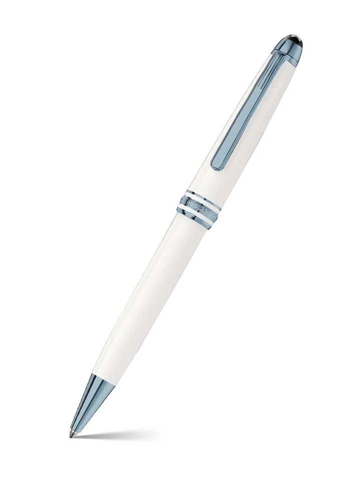 The Meisterstück Glacier Classique Ballpoint Pen in white precious resin is inspired by the mystical glaciers of the Mont Blanc Mountain, that stands for Montblancs dedication to high quality products and its attitude towards exploration and adventurous spirits. The blue PVD coated fittings highlight the beauty of the writing instrument.