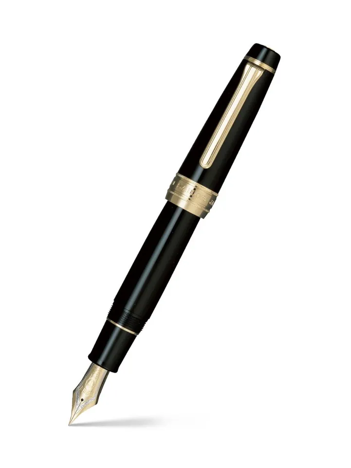 The King of Pen Pro Gear Black Gold combines the heft of the King of Pen size with the flat-ends of the classic Sailor Pro Gear model. The nib has a slightly springier feel and performance, and is crafted from 21k solid gold. The Sailor Anchor logo, in gold-plated brass, adorns the top of the cap. The pen benefits from Sailors excellent cartridge-converter design, allowing it to be filled with bottled ink (using the provided converter) or with Sailor ink cartridges. The pen is packaged in a brown velvet gift box and comes with two starter cartridges.