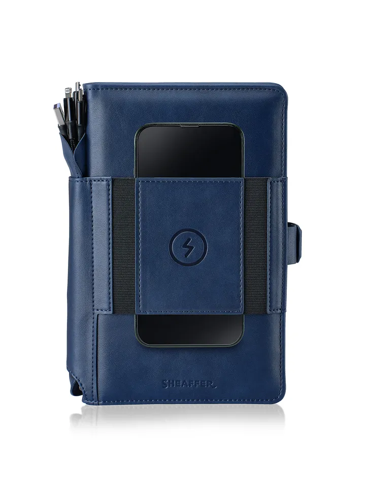 This slim and compact Sheaffer Superbook Mini t is equipped with a 8000 mAh power bank capable of wireless and cable charging. The soft touch, premium cover features a magnetic auto-closure mechanism and has an expandable elastic band to hold your phone while charging.